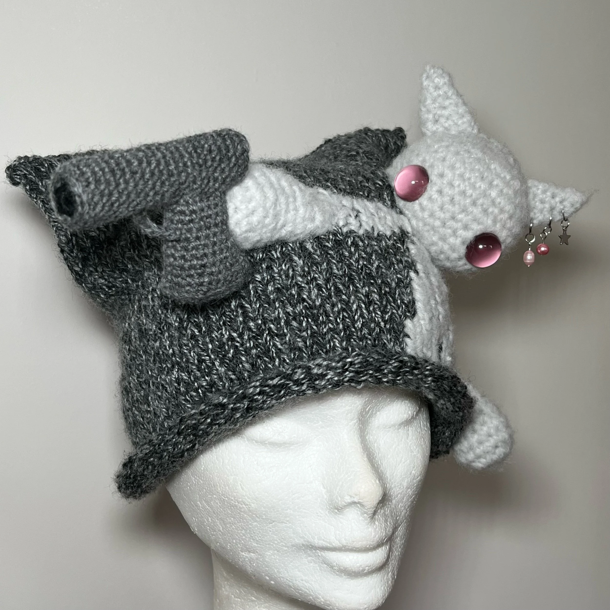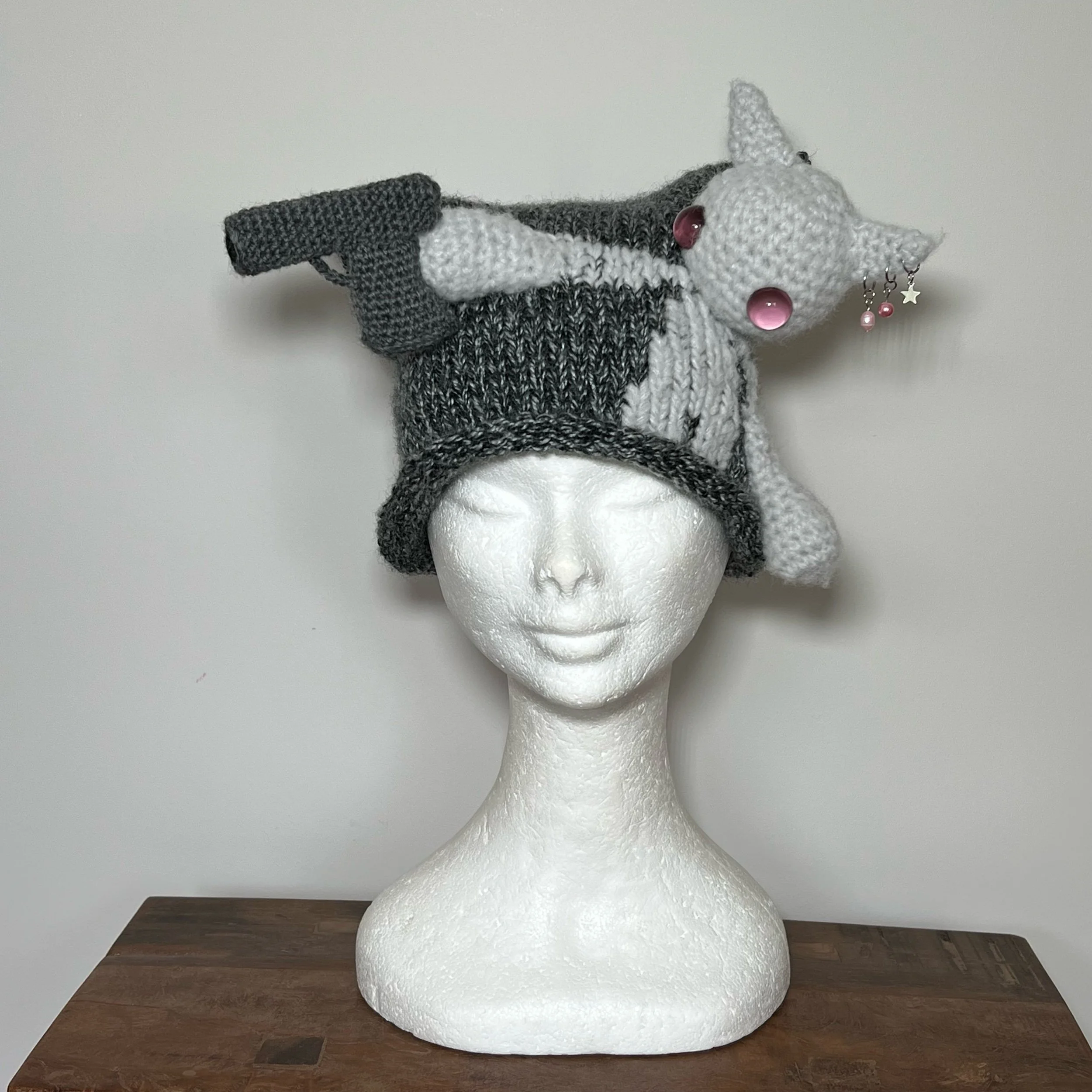 Hand knit & crocheted cat hat. Two Kazm cats merged together for this hat to be possible. One of the cats was carrying weapons across portals. Her pistol is a feature of this hat.