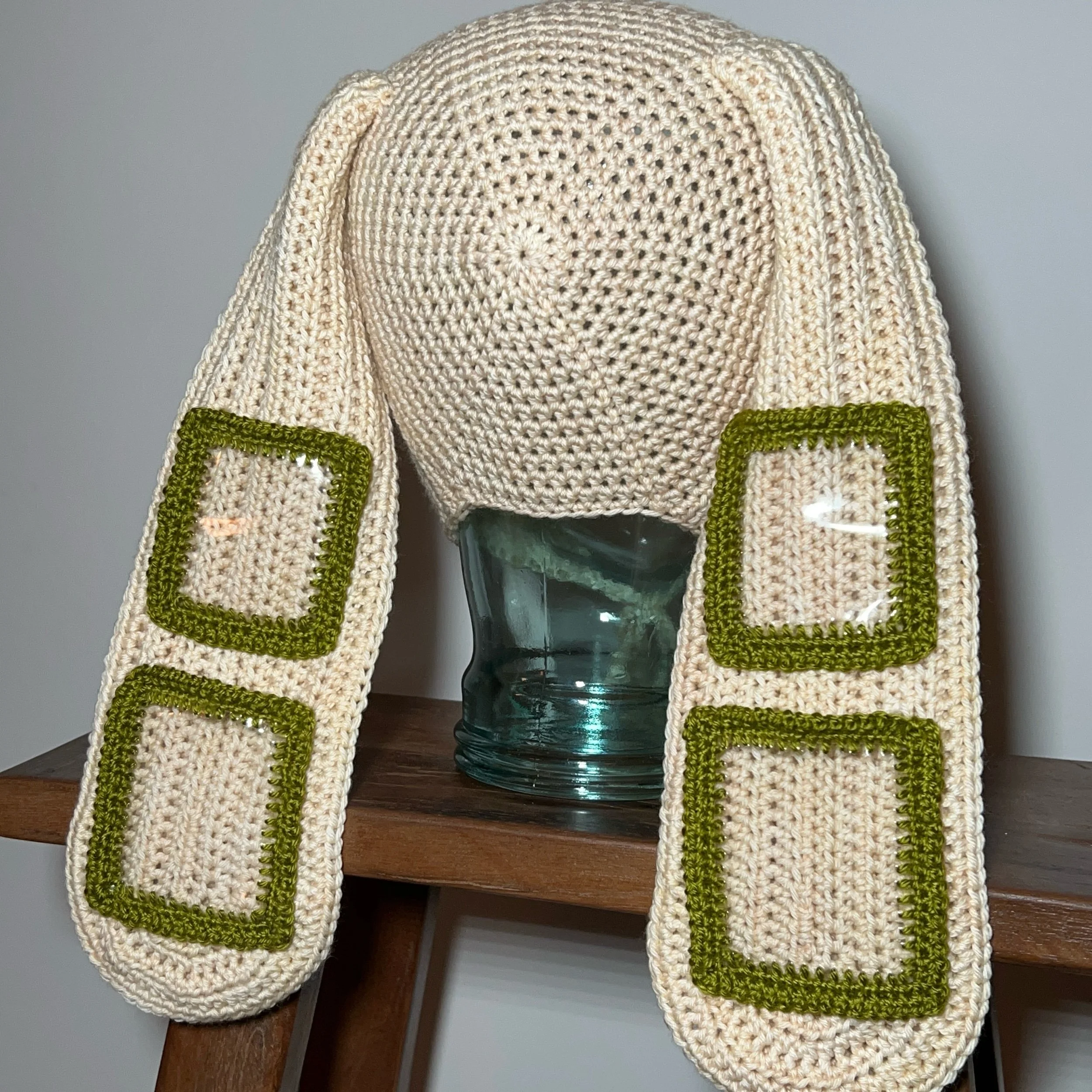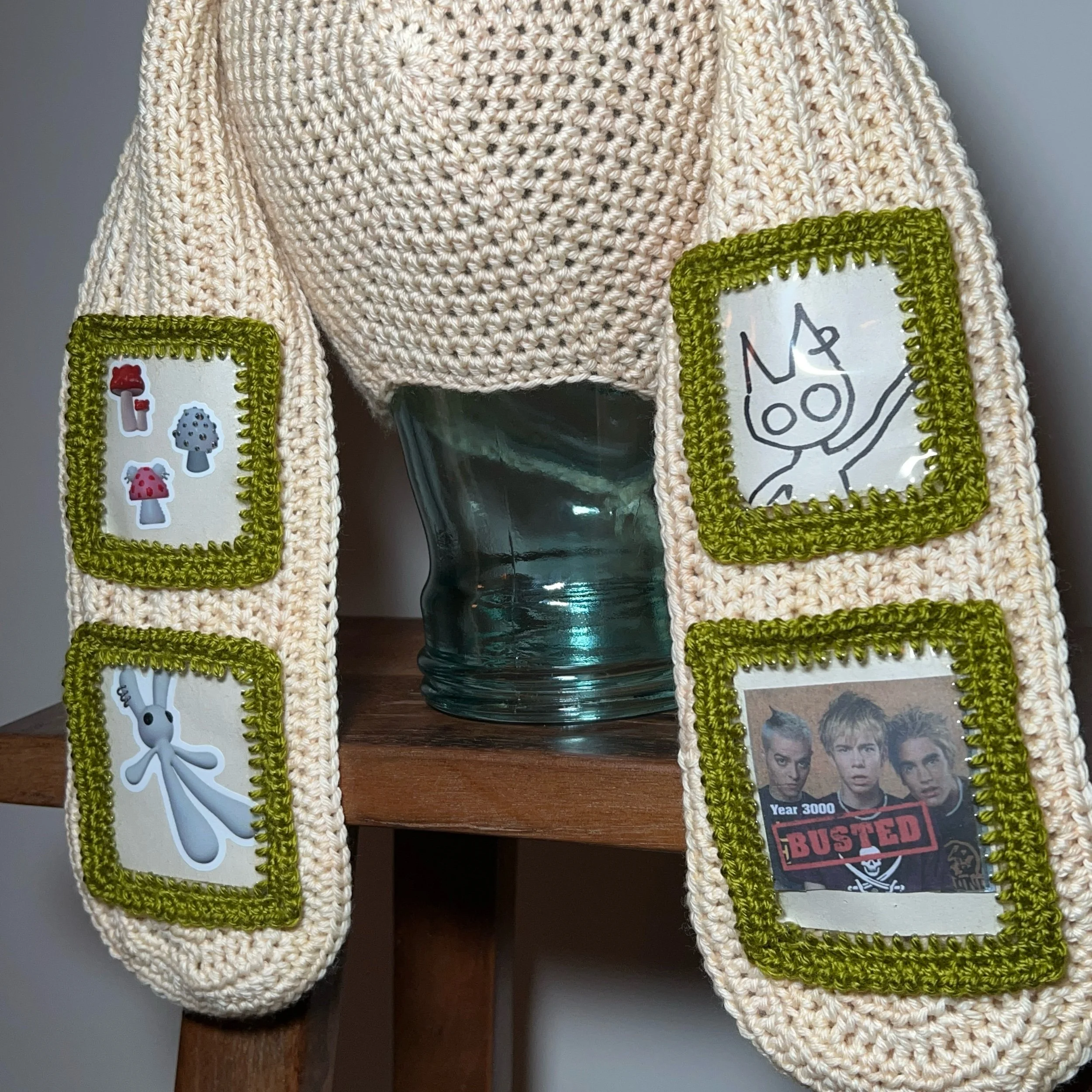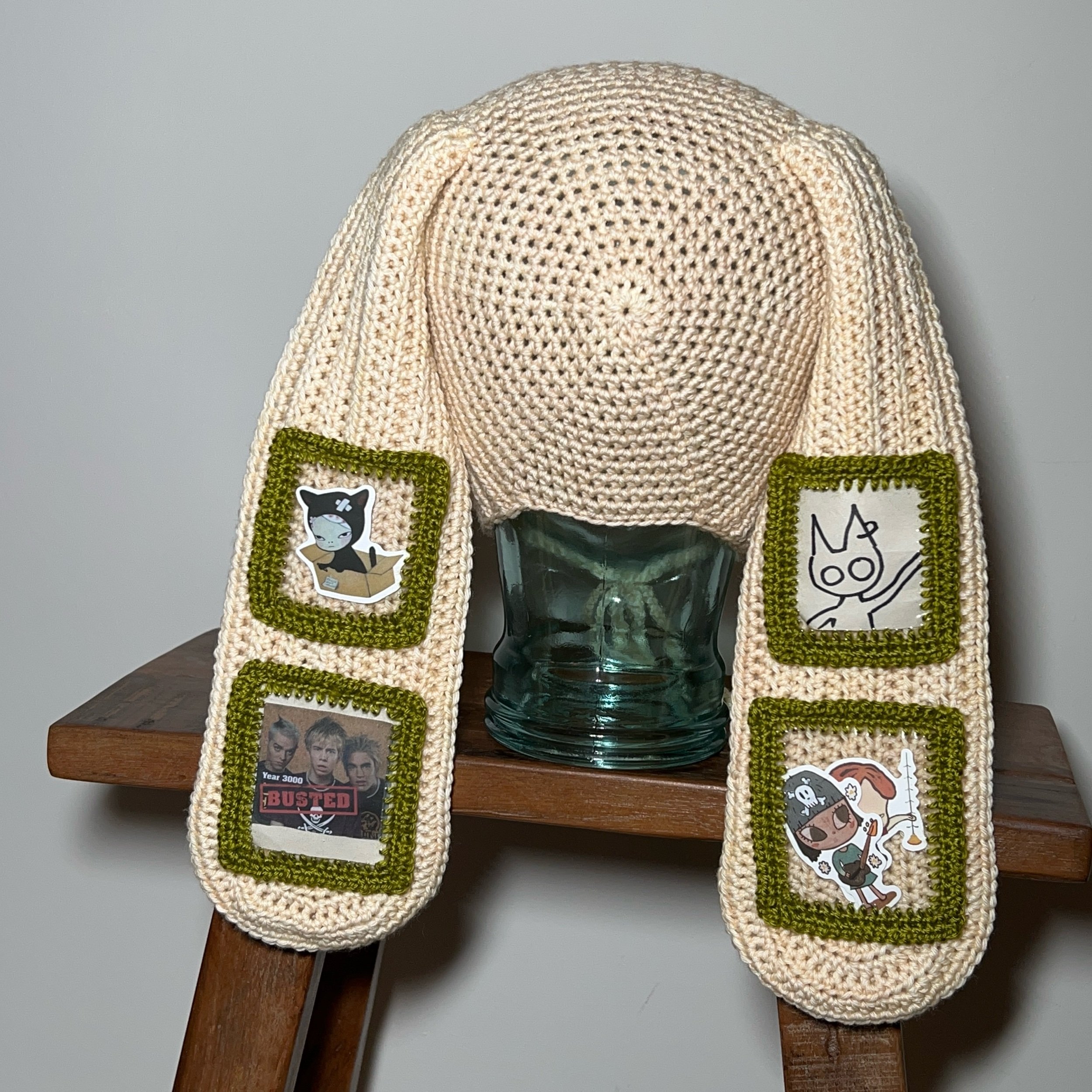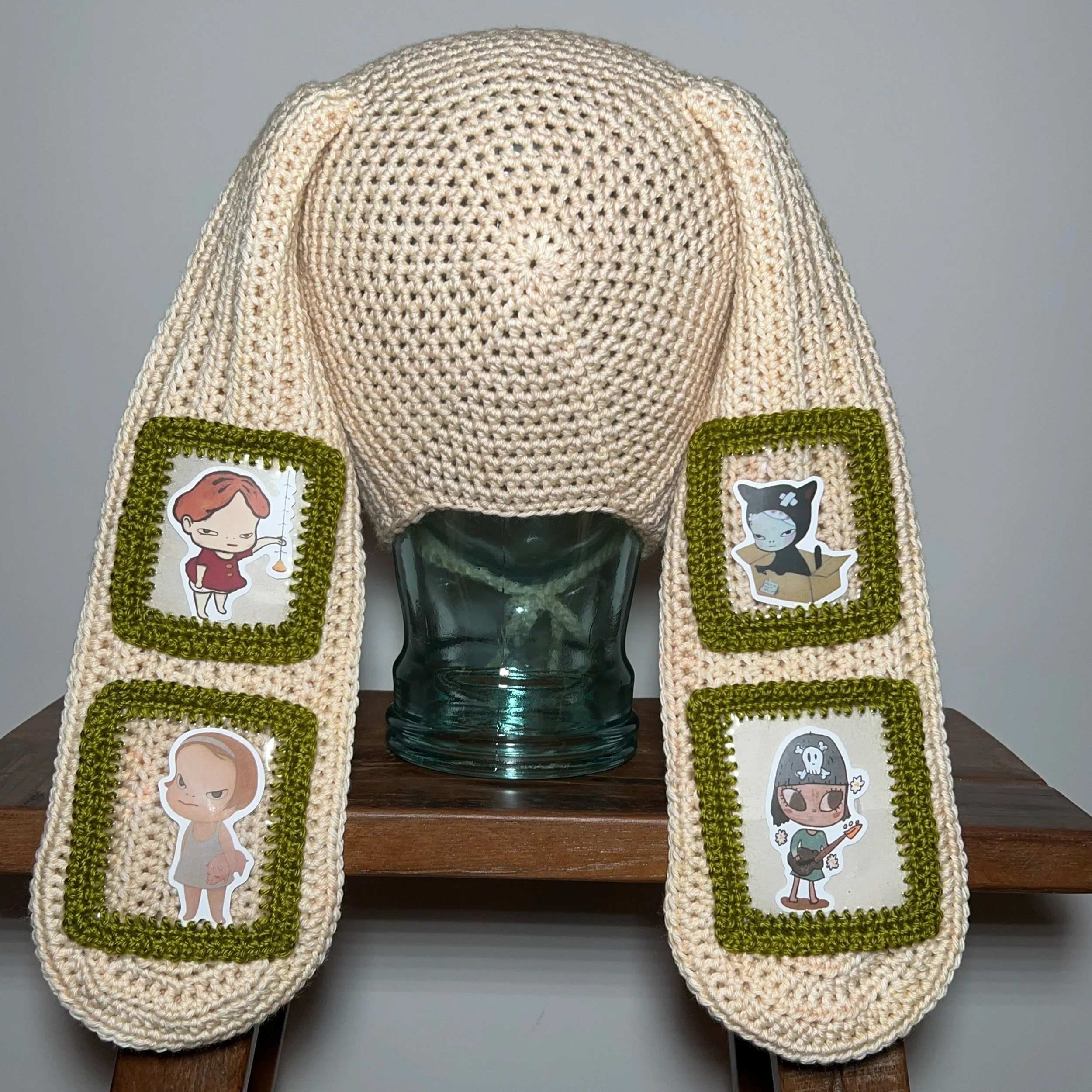 Crochet pocket bunny bonnet but this bunny was a collector of art so their pockets are picture frames to display artwork and photos! Comes with templates so you can cut out and add your own art and photos to the picture frames