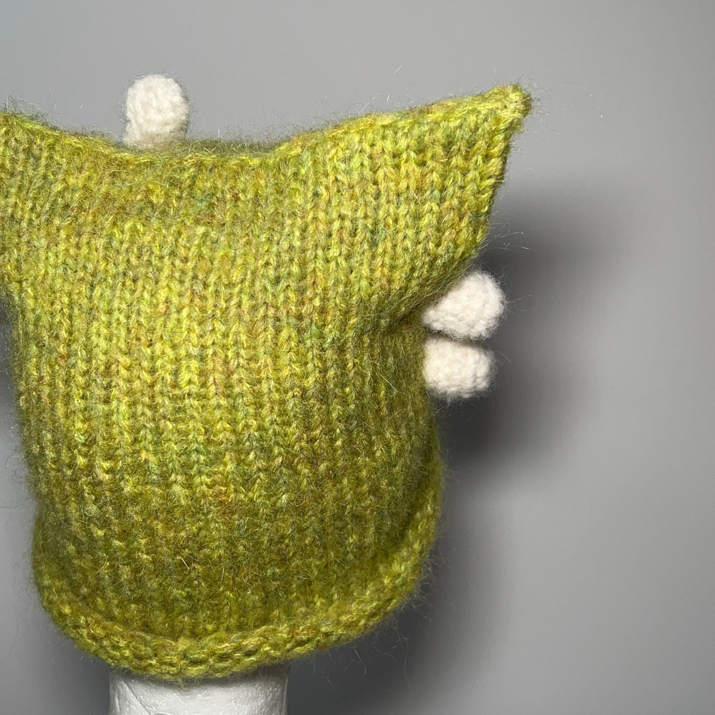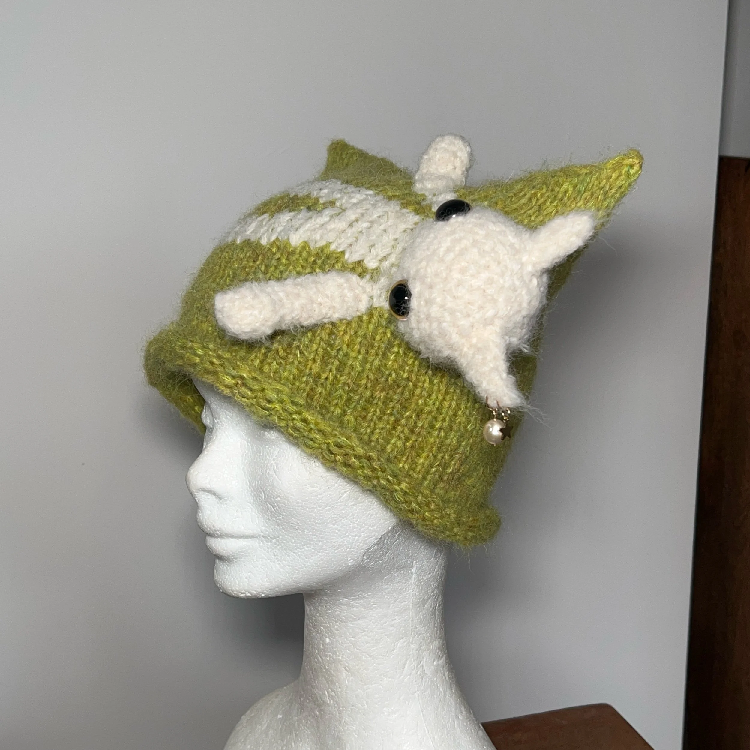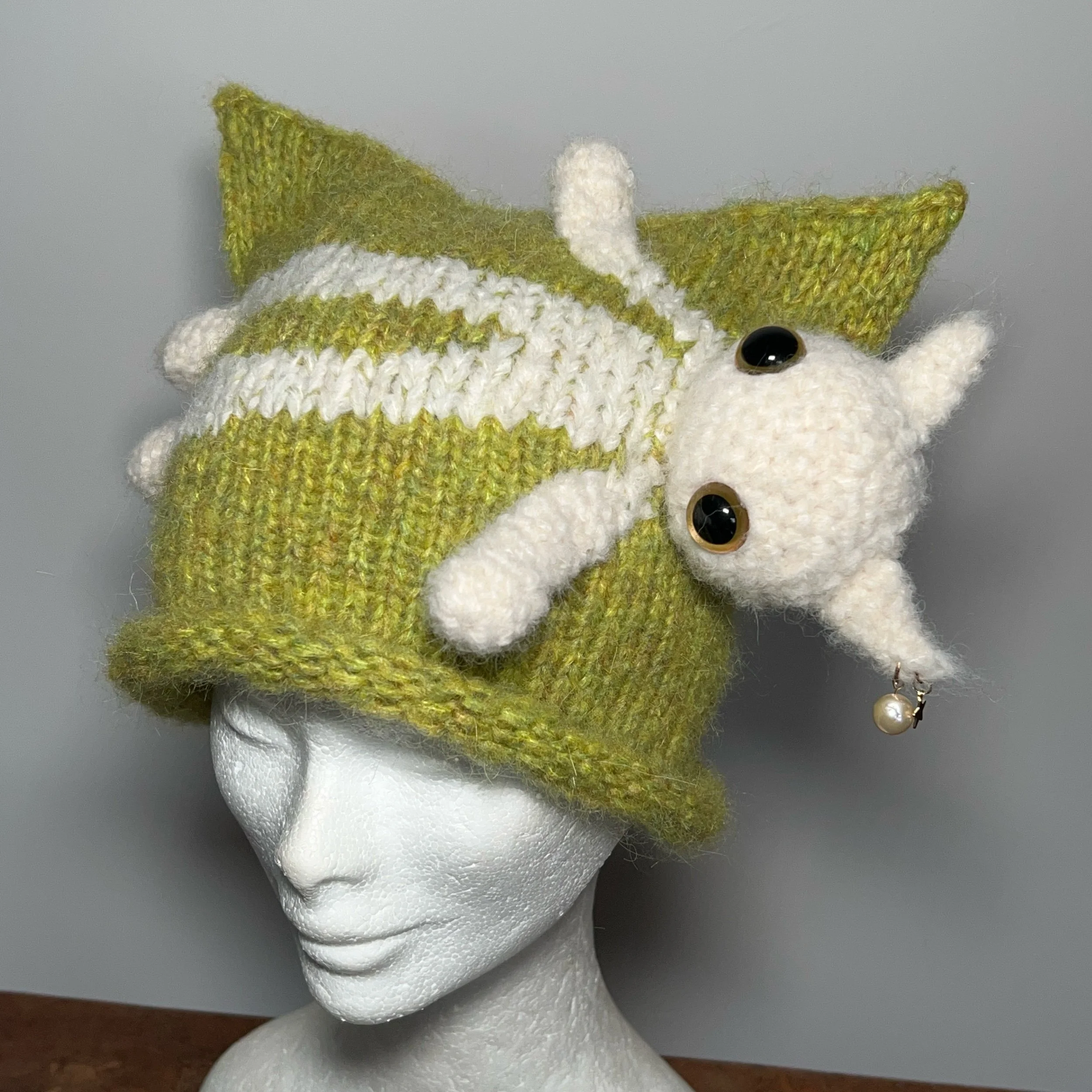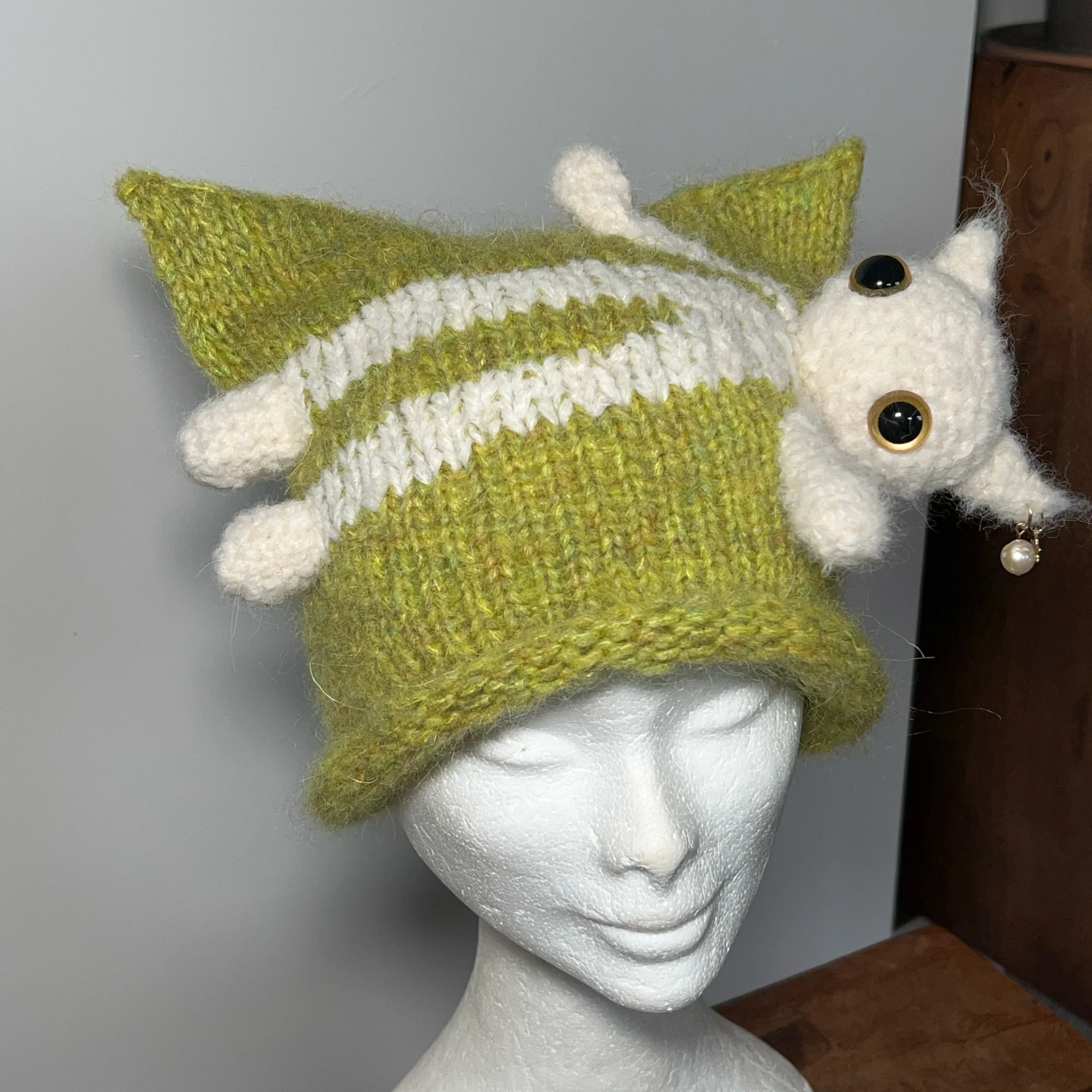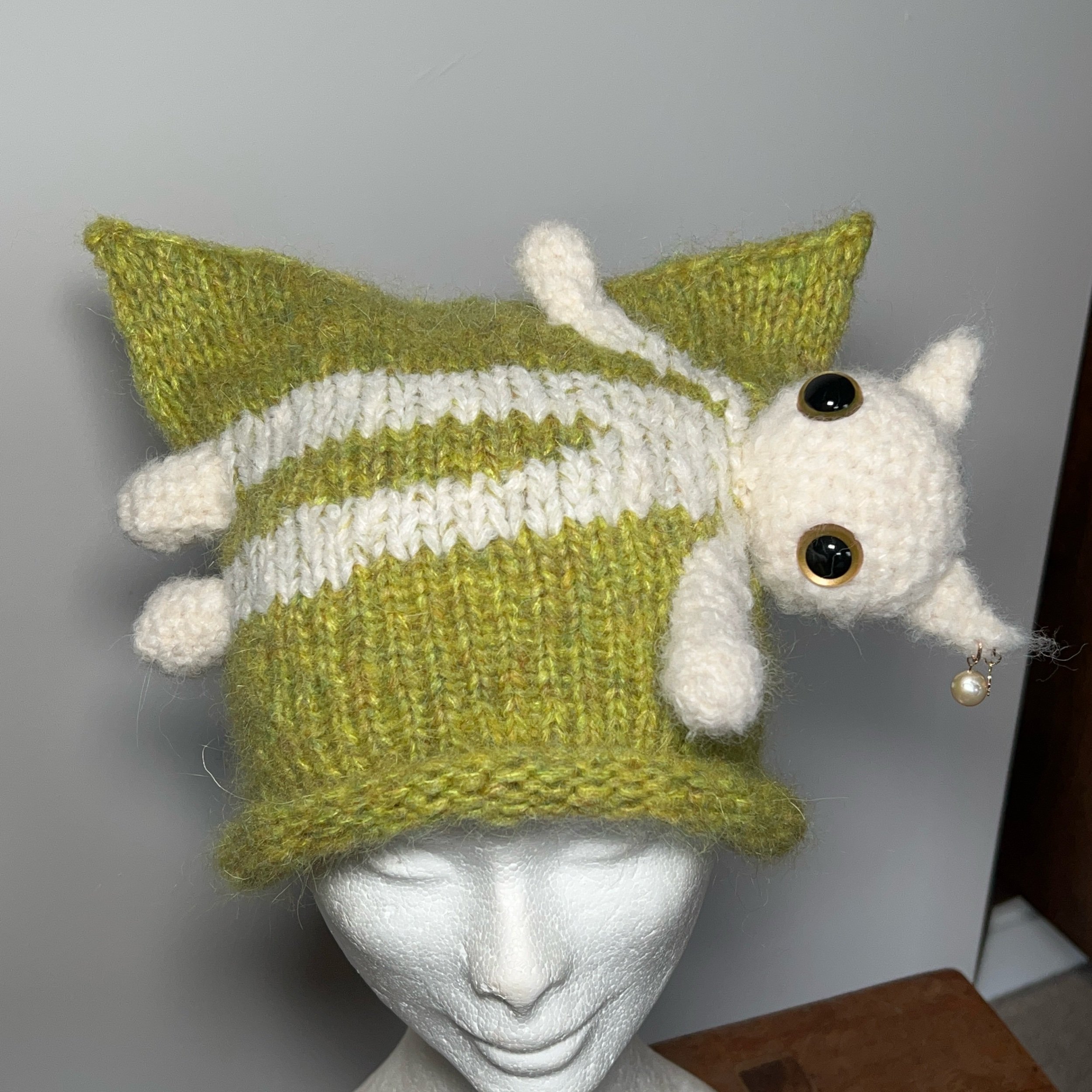 Hand knit & crocheted cat hat. Two Kazm cats merged together for this hat to be possible.