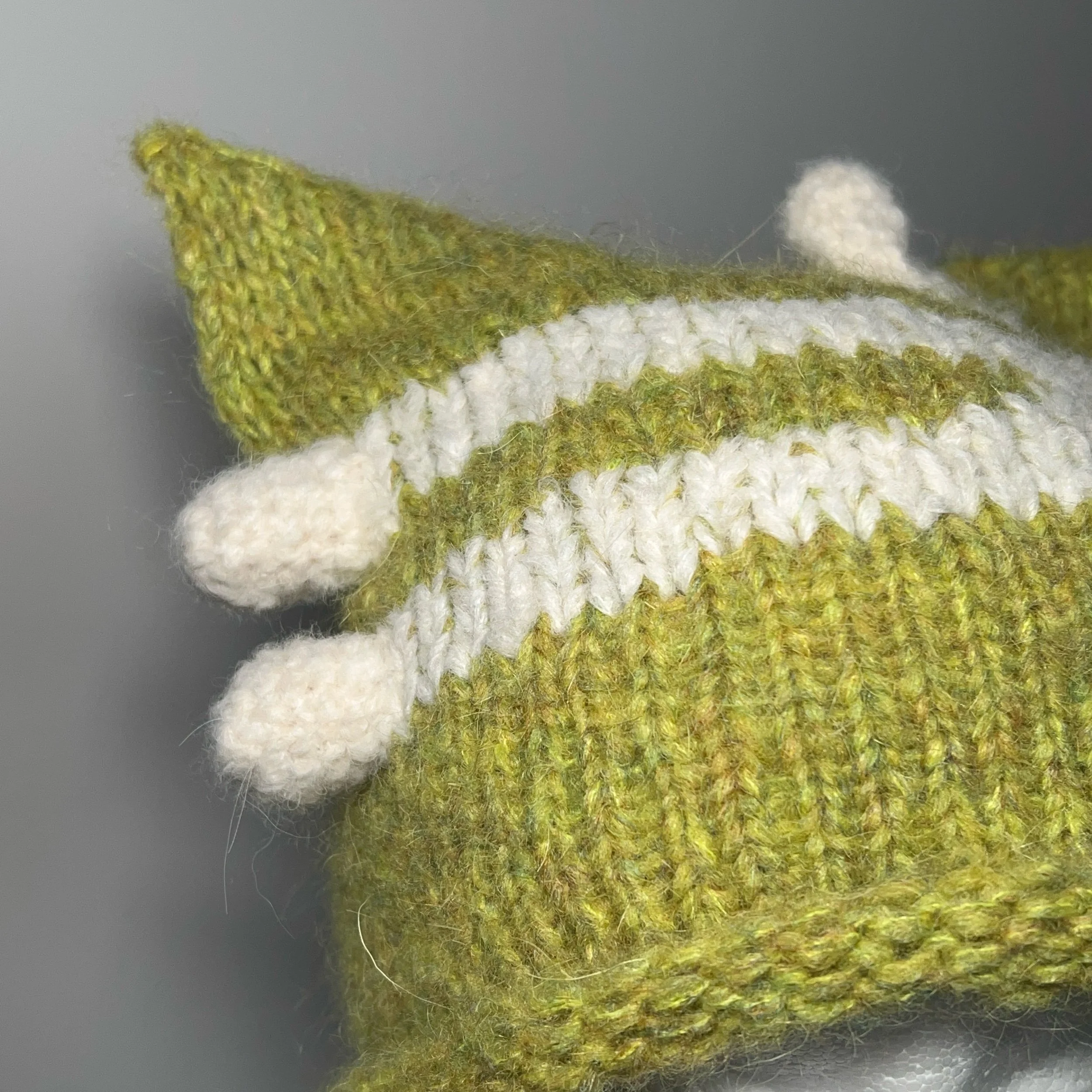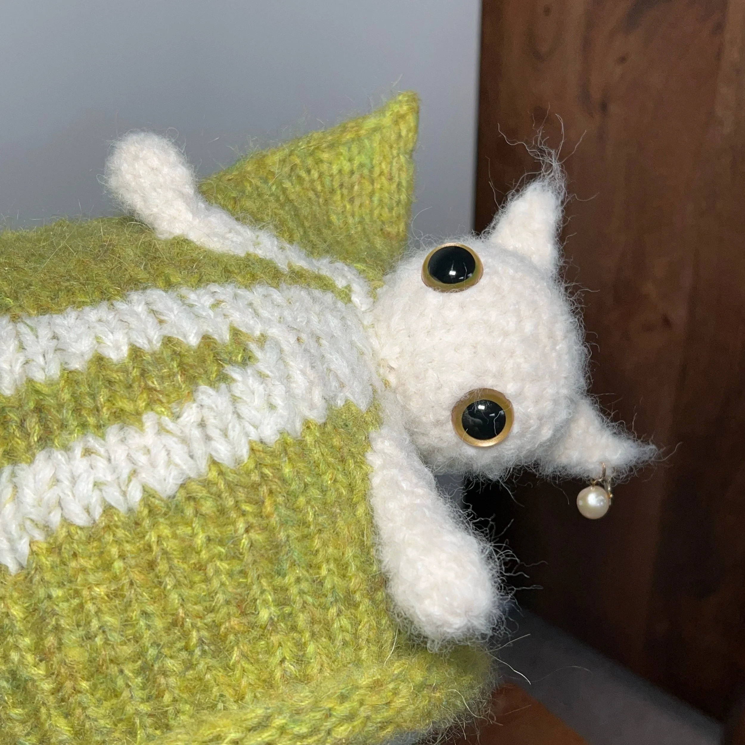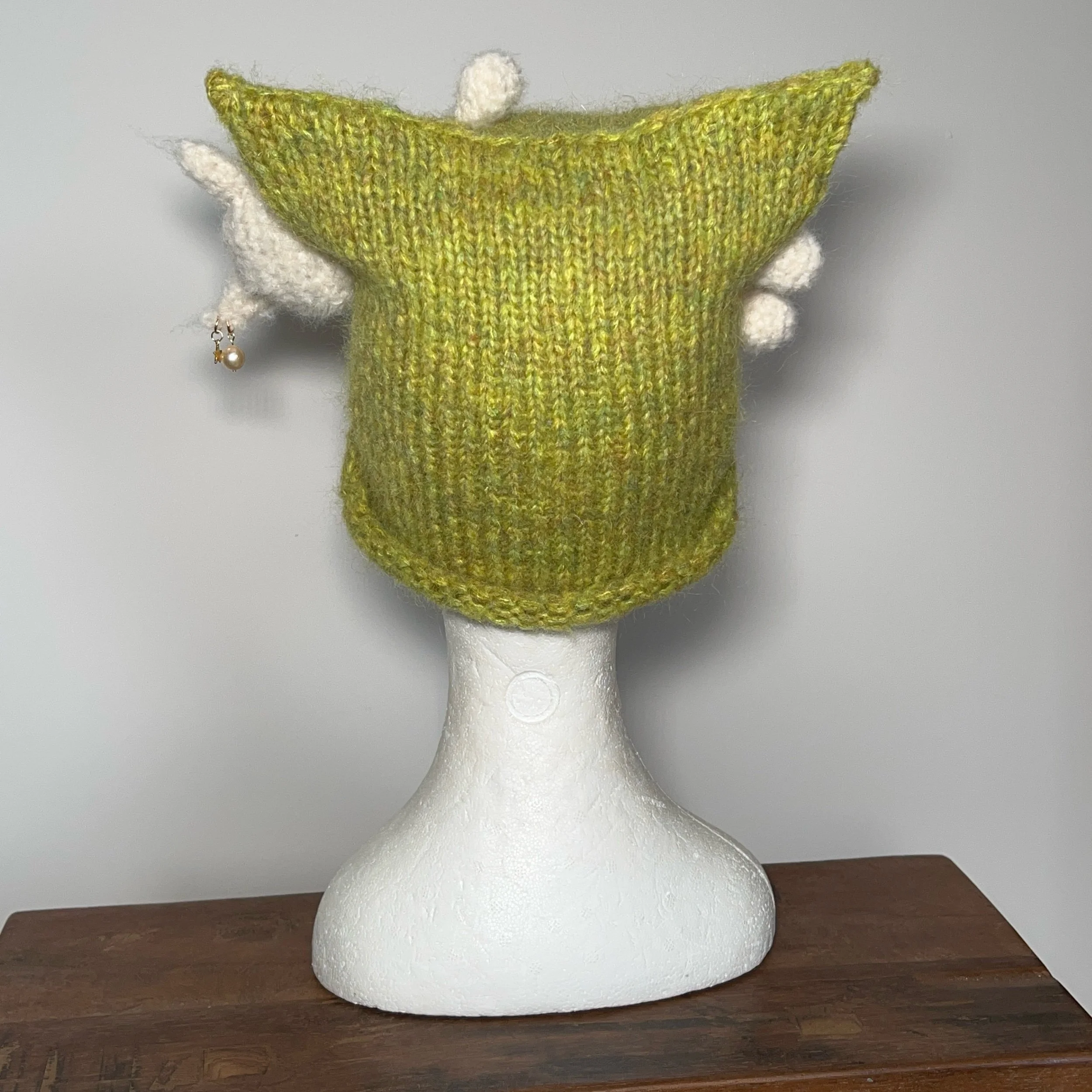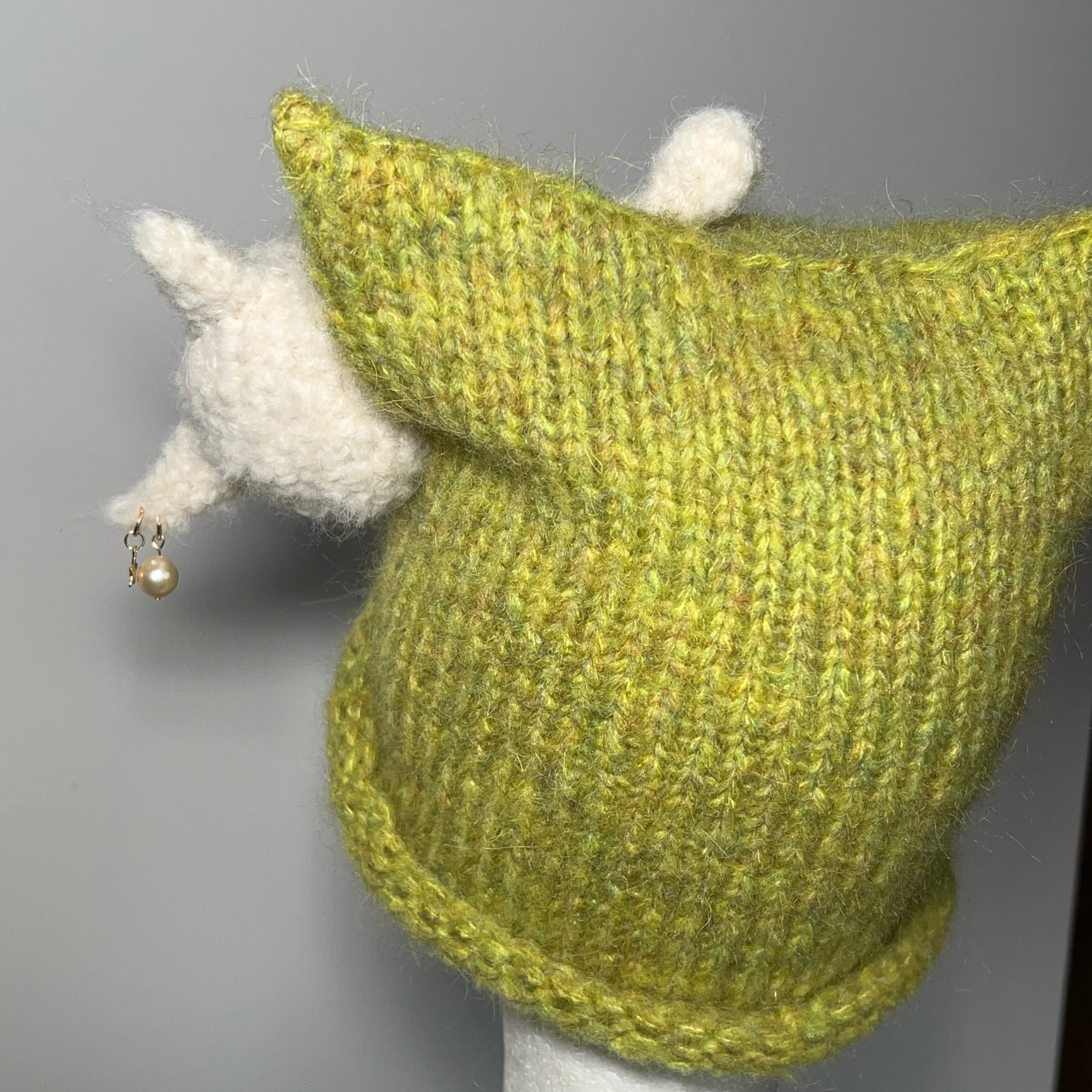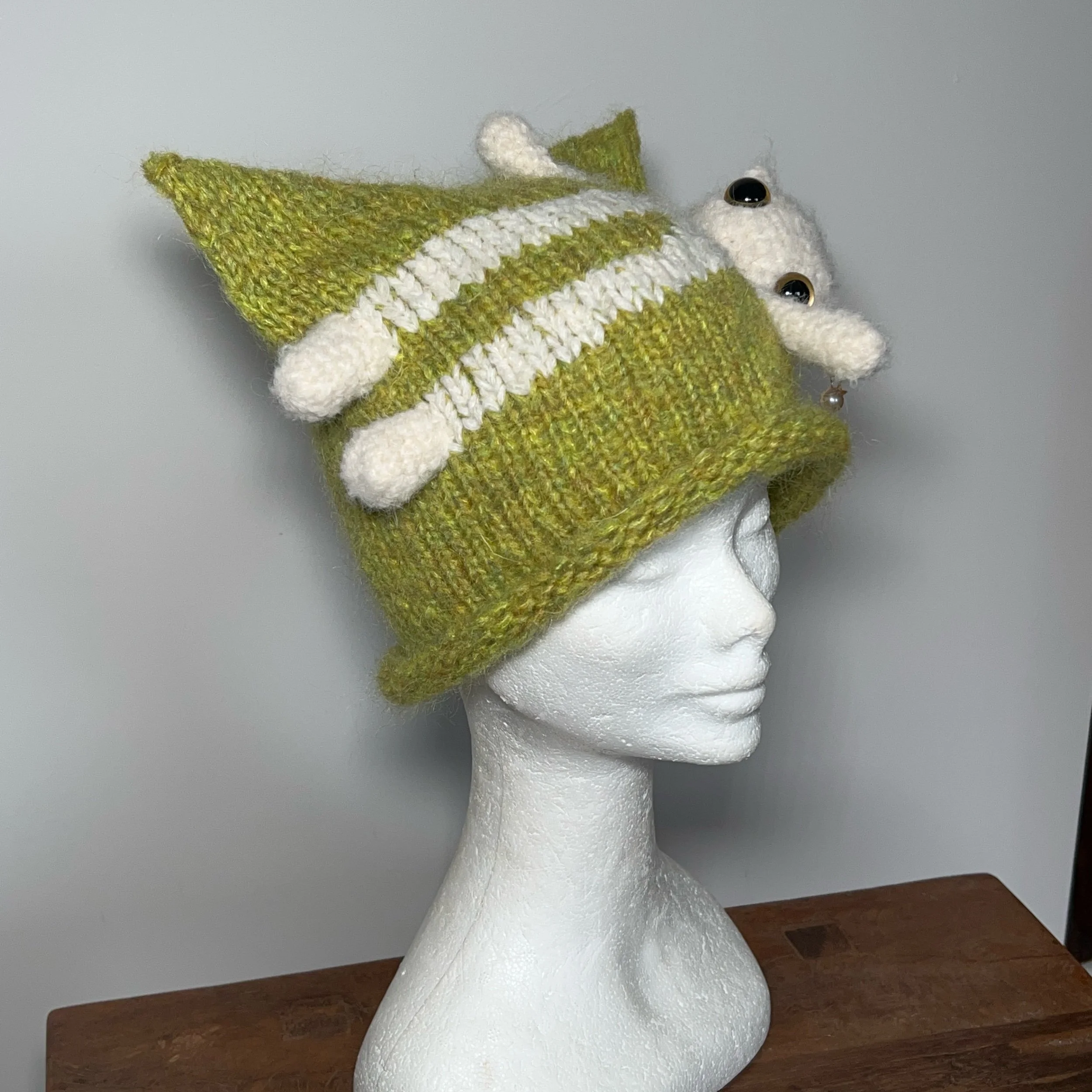 Hand knit & crocheted cat hat. Two Kazm cats merged together for this hat to be possible.